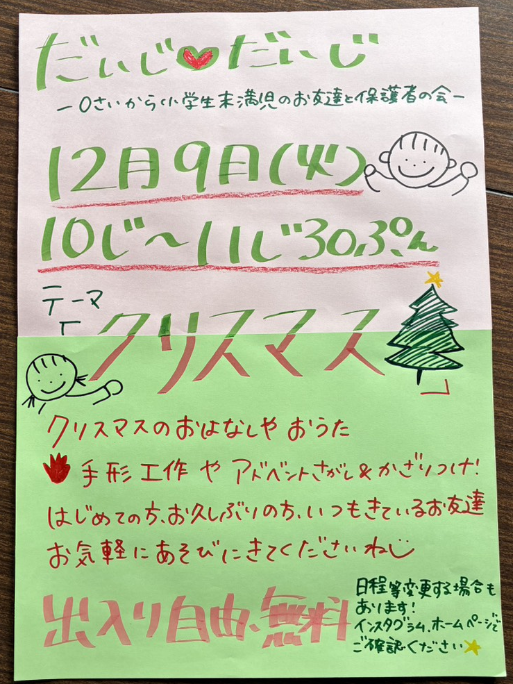 新しいお知らせ 2022.11.132025.11.05 だいじ♡だいじ 0歳から小学生未満の子どもと保護者の集い出入り自由・無料日程・プログラムの変更をする場合もあります。インスタグラムでご確認ください。