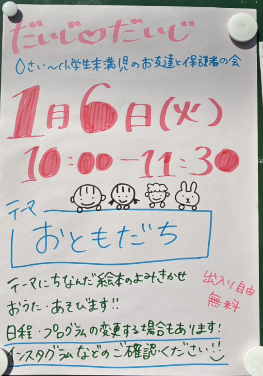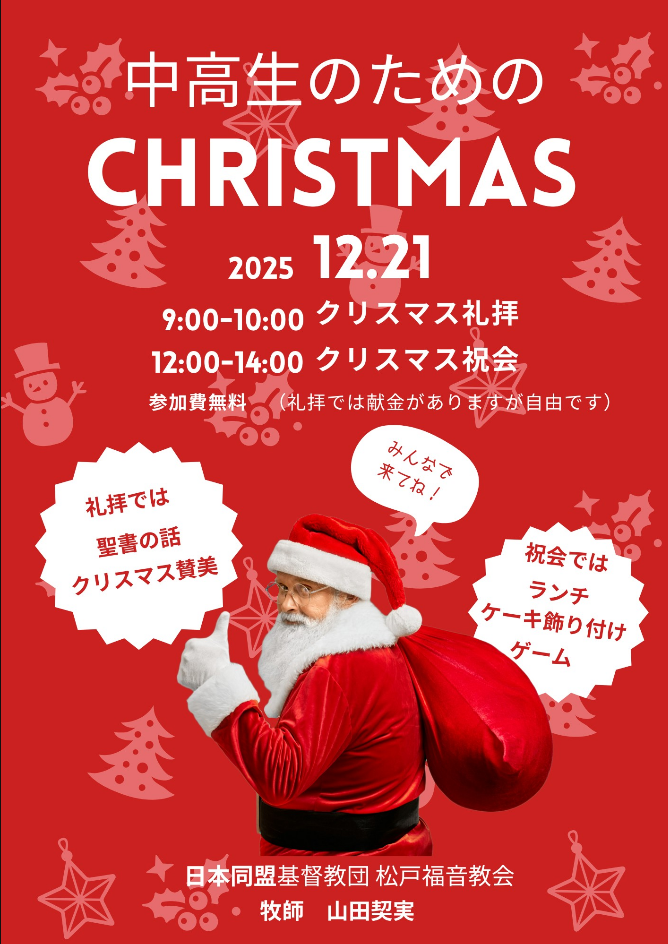 新しいお知らせ 2022.11.132025.12.16 ジュニアクリスマス礼拝・祝会 クリスマスの集い だいじ♡だいじ 0歳から小学生未満の子どもと保護者の集い出入り自由・無料日程・プログラムの変更をする場合もあります。インスタグラムでご確認ください。